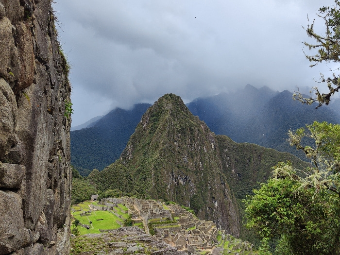 Machu Picchu ruins are nestled in the Andes mountains under a cloudy sky. A lush green mountain peak rises prominently above the ancient stone structures. To the left, a towering Incan wall with visibβ¦read more