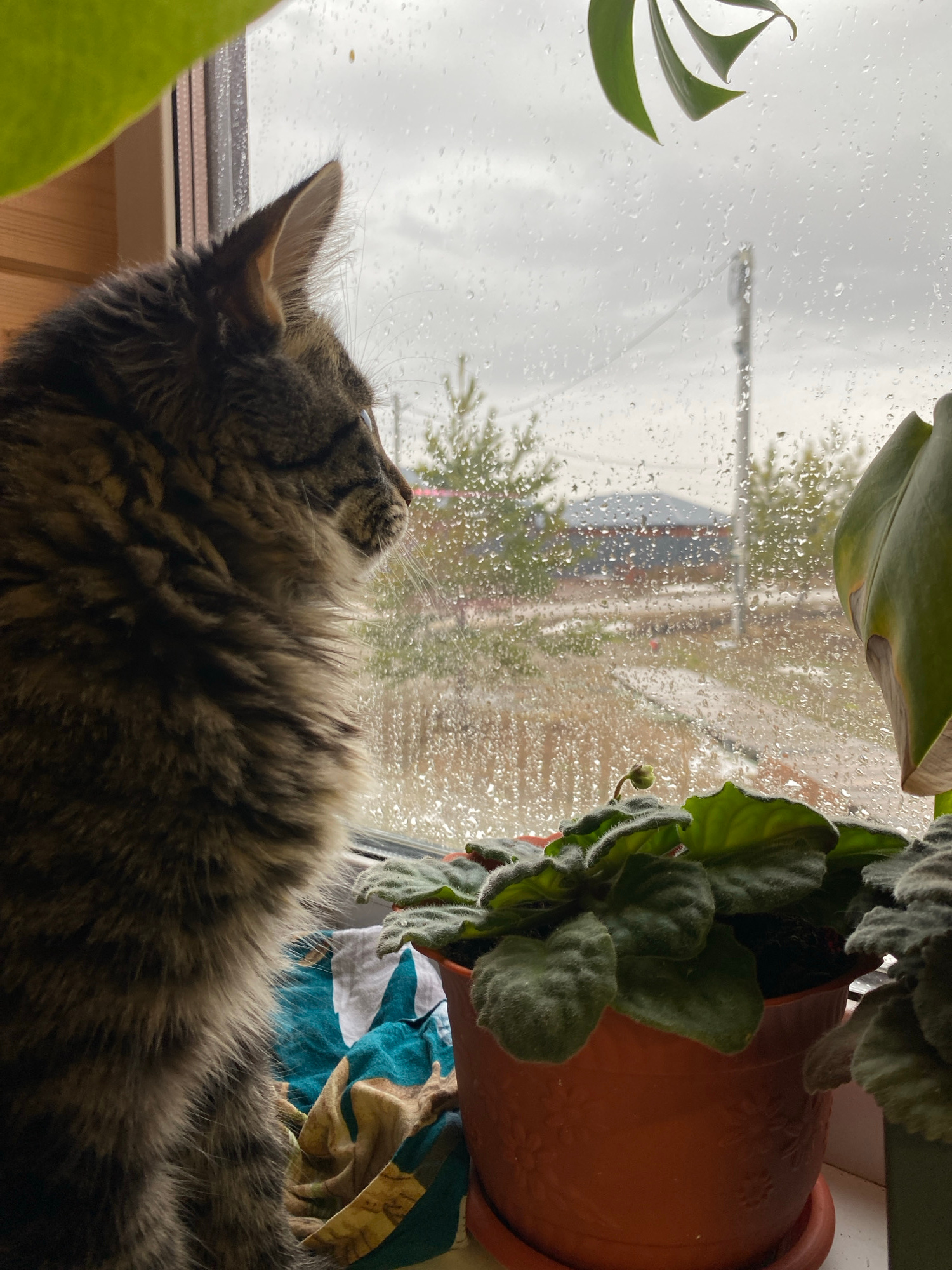 A fluffy, tabby cat is gazing out a window covered in raindrops. The cat is positioned on a windowsill next to a terracotta pot with a green, leafy plant. Outside the window, the blurred scene suggest…read more