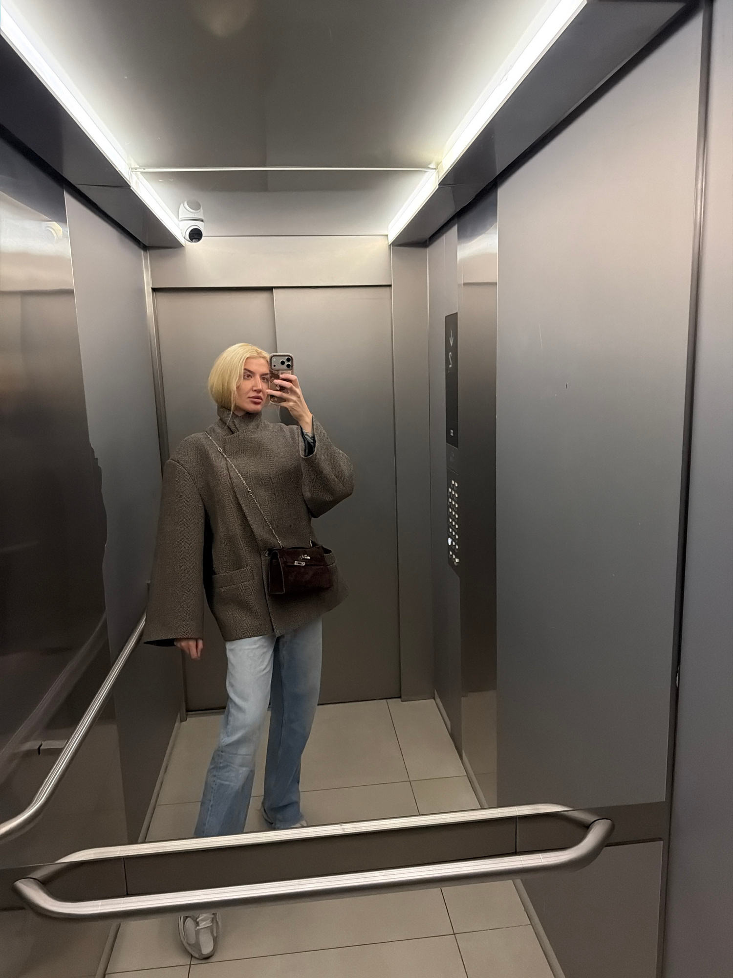 A person stands in an elevator, taking a selfie. The elevator is metallic, with illuminated panels and controls, and includes a handrail. The person is wearing jeans and a brown blazer and a brown sho…read more