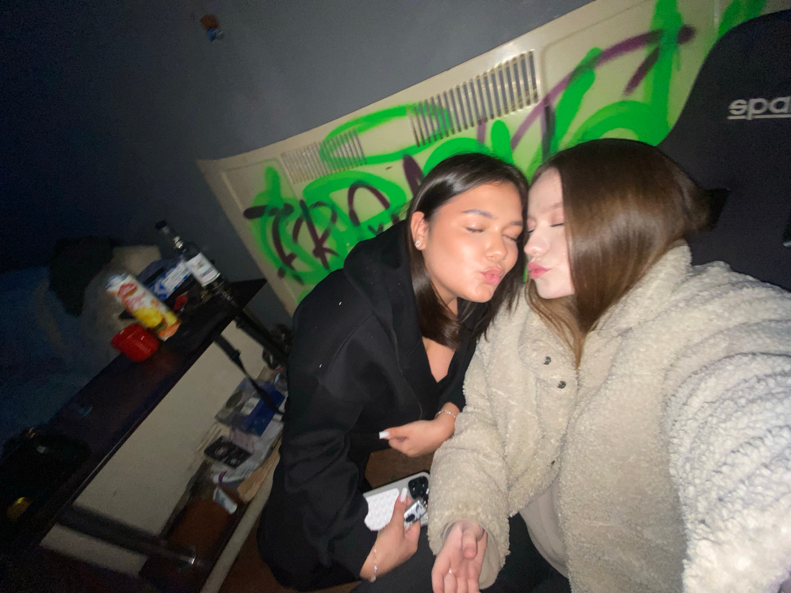 Two young women are posing closely together, facing towards the camera with their eyes closed. The woman on the left has dark hair and is wearing a black hooded sweatshirt. Her lips are pursed as if i…read more