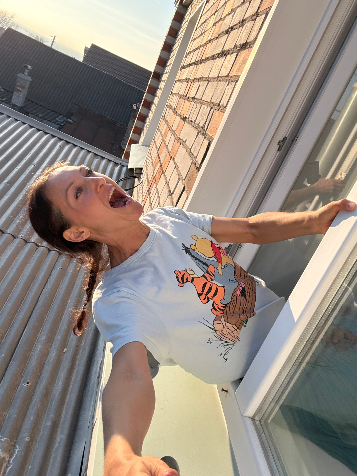 A woman hangs upside down from a window frame. The woman has brown hair pulled back in a braid and is wearing a light blue t-shirt with a Winnie the Pooh graphic. Her mouth is open in a wide smile orβ¦read more
