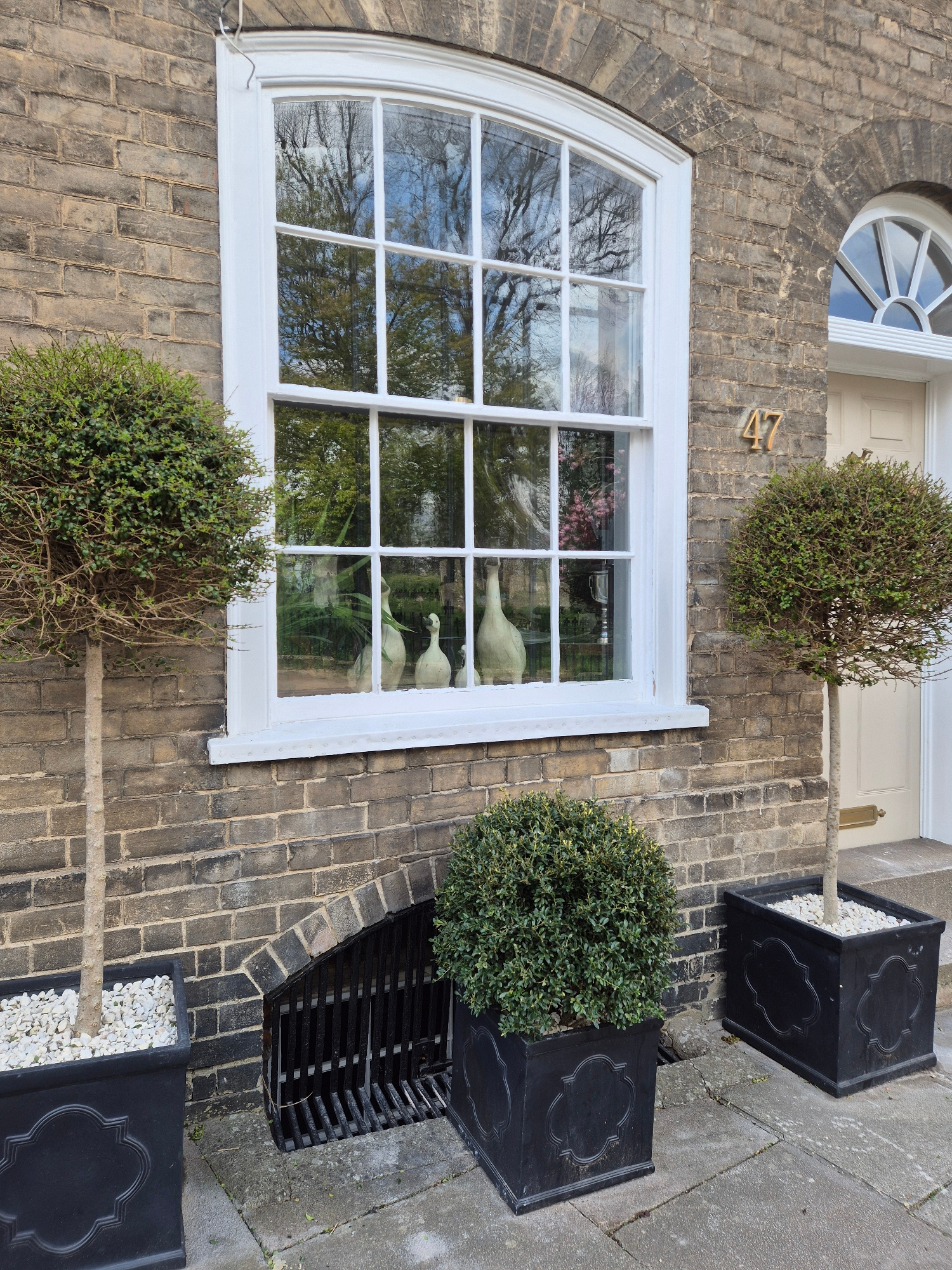 The image shows a section of a building exterior, likely a residential property, in West Suffolk, United Kingdom. The building is constructed of grey brick, with a large, arched window dominating the…read more