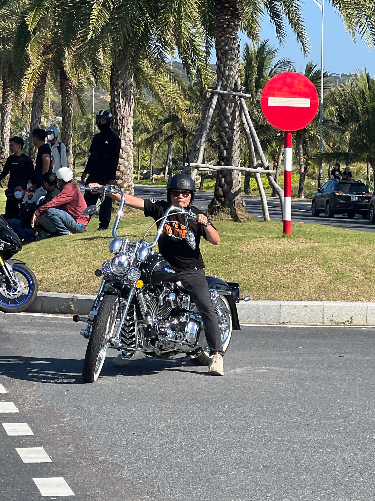 A daytime scene on a paved road in Cam Ranh, Vietnam, features a customized motorcycle and multiple individuals. Centrally positioned, an adult male rider, wearing a black helmet, sunglasses, and a bl…read more