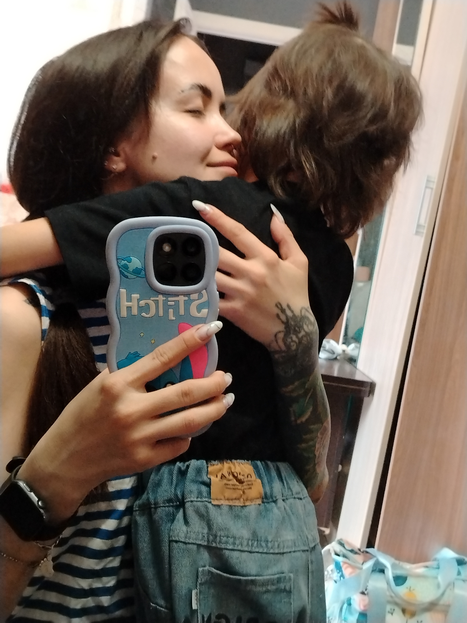 A woman with long brown hair and a tattoo on her left arm embraces a small child with brown hair. She is holding a smartphone with a blue "Stitch" themed case. The woman is wearing a striped shirt and…read more