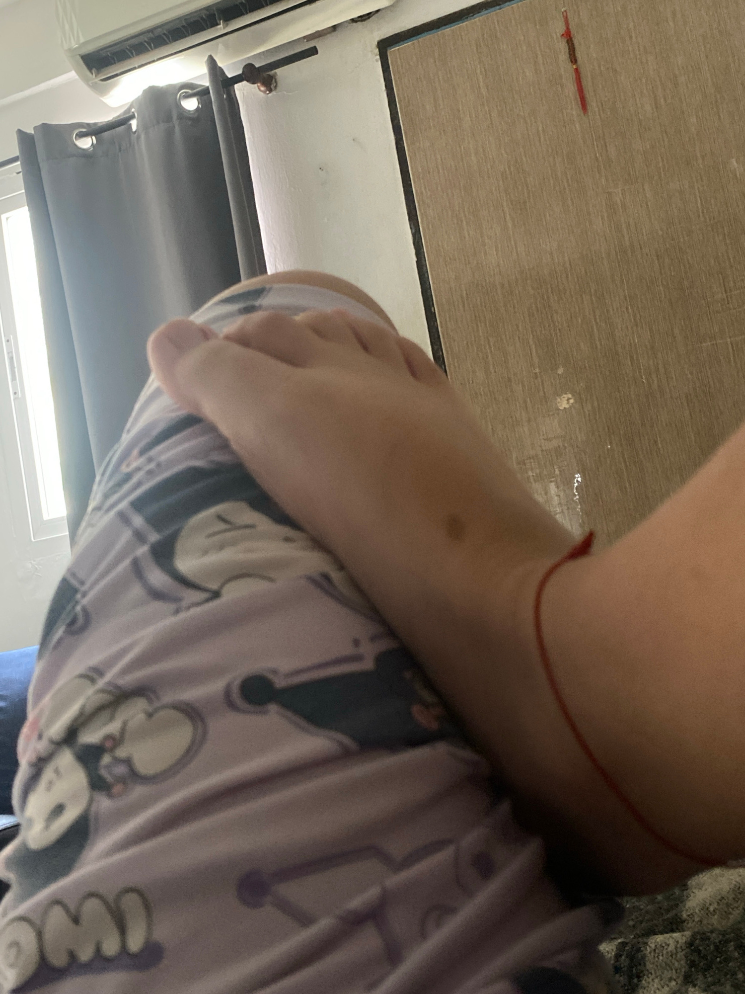 A close-up shot shows a foot resting on top of pajama pants with a cartoon print. The person is wearing a red string anklet. The background includes a wooden surface, a gray curtain, and what appears…read more