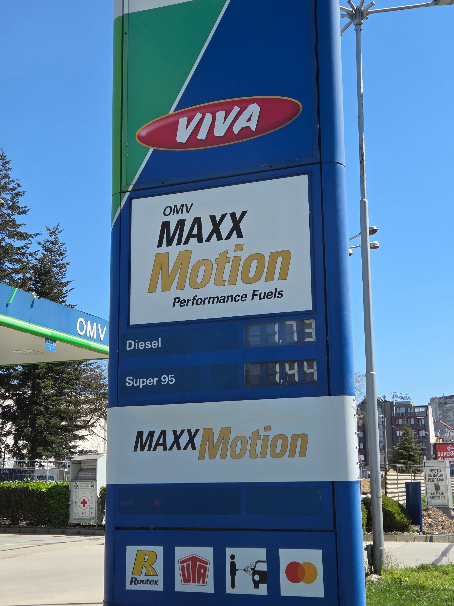 The image shows a gas station sign with the "VIVA" and "OMV" logos. The sign displays the price of Diesel at 1.73 and Super 95 at 1.44. The sign is also labeled "MAXXMotion". The station's brands that…read more