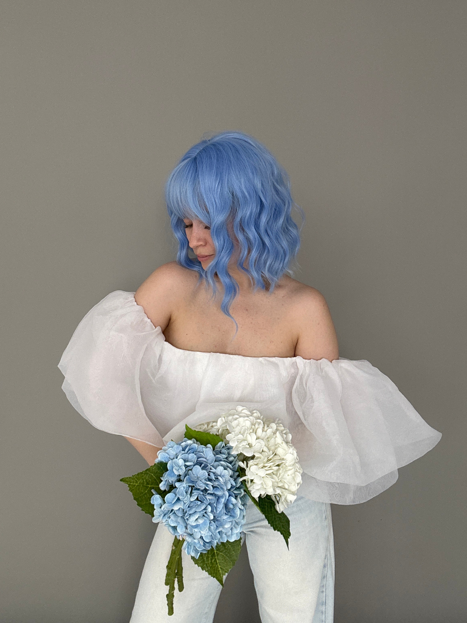 A fair-skinned individual with shoulder-length, wavy, blue hair is reclining on a gray surface, wearing light-wash denim jeans and a voluminous white top. They are holding a bouquet of white and blue…read more