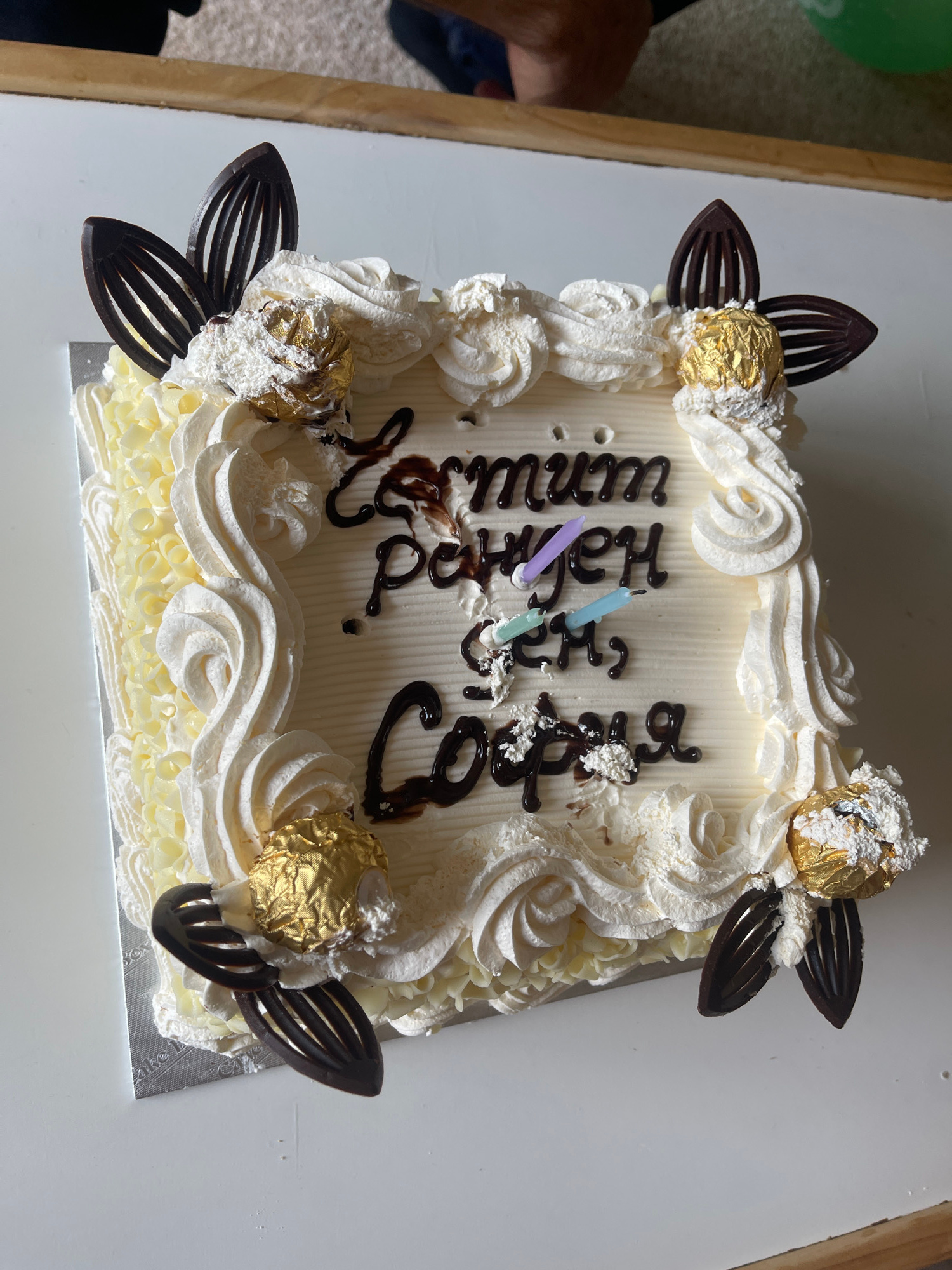 A square birthday cake, likely in a domestic setting. The cake has white frosting with decorative swirls along the top edges and a layer of smaller decorative elements along the bottom edge. Four Ferr…read more