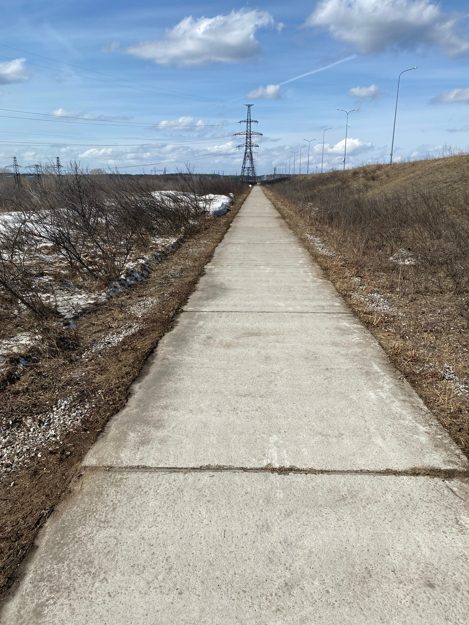 The image depicts a concrete pathway stretching into the distance. On the right of the path is dry vegetation and gravel. On the left, the view includes power lines, utility poles and a blue sky with…read more