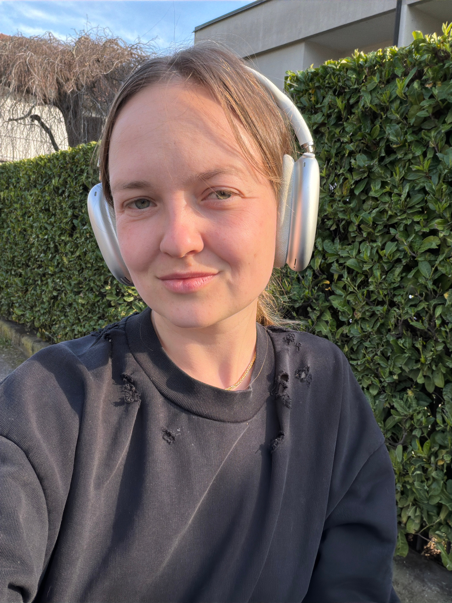 A young woman poses for a selfie outdoors. She wears silver headphones and a dark-colored, slightly distressed sweatshirt. A delicate gold chain is visible around her neck. The background consists ofโฆread more