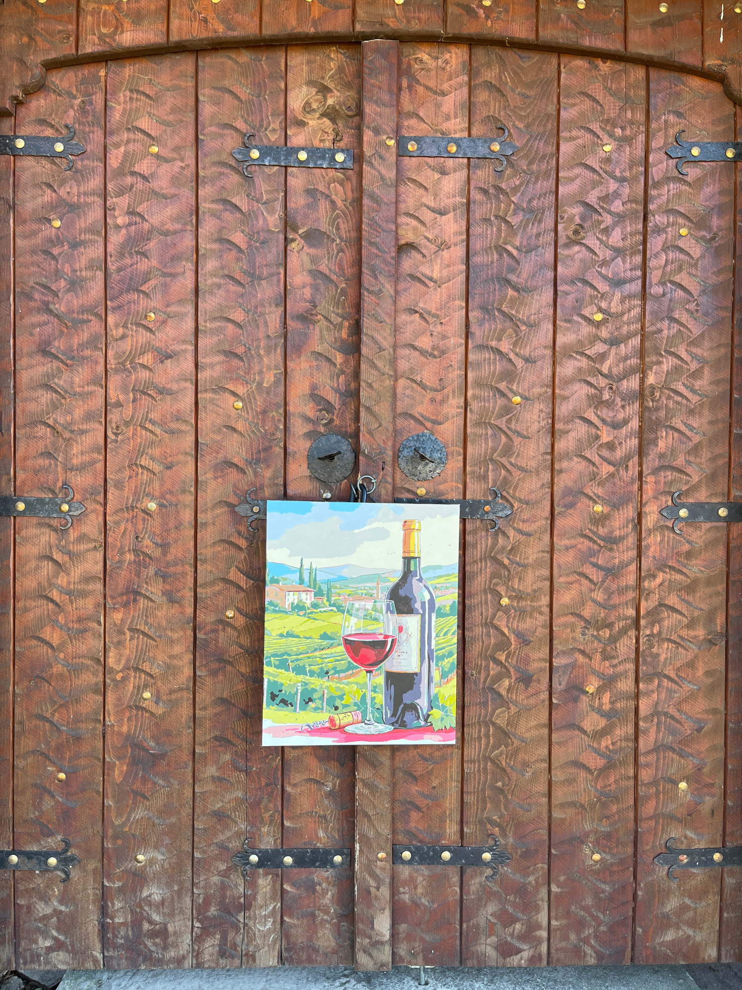 A wooden door, textured with horizontal planks carved in a chevron pattern, is adorned with decorative black metal hinges and brass rivets. Centered on the door is a rectangular painting depicting a b…read more