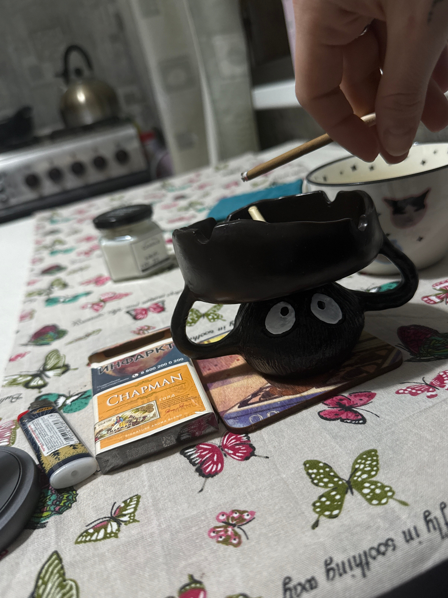 A person is holding a wooden stick or small dowel near a cup or bowl. A black, cartoonish mug with large white eyes sits on a butterfly-patterned tablecloth alongside a pack of "CHAPMAN" cigarettes, a…read more
