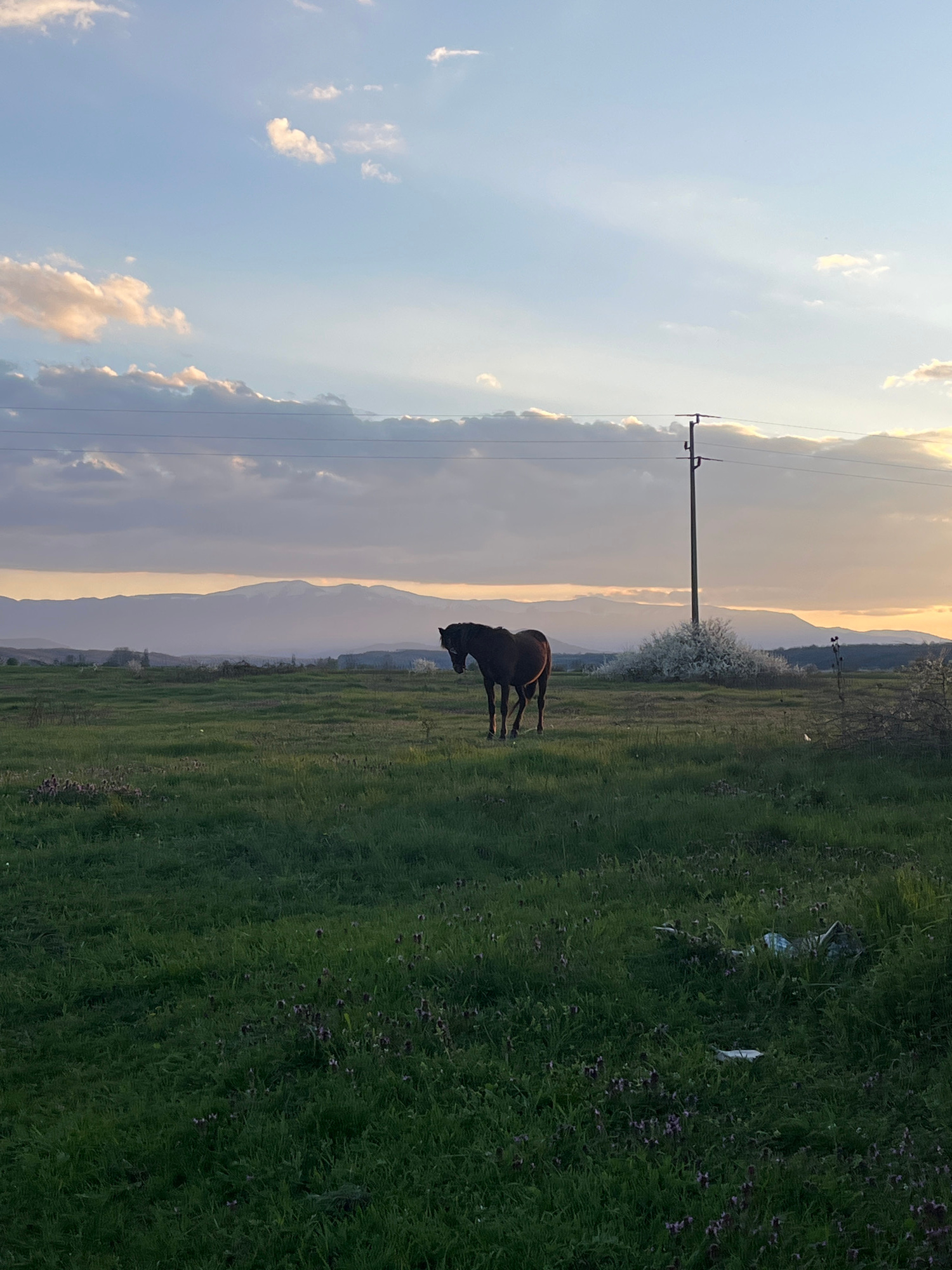 The image shows a landscape with a horse grazing in a green field. A utility pole stands upright in the middle ground, slightly left of center. Behind the field, a row of low mountains is visible unde…read more