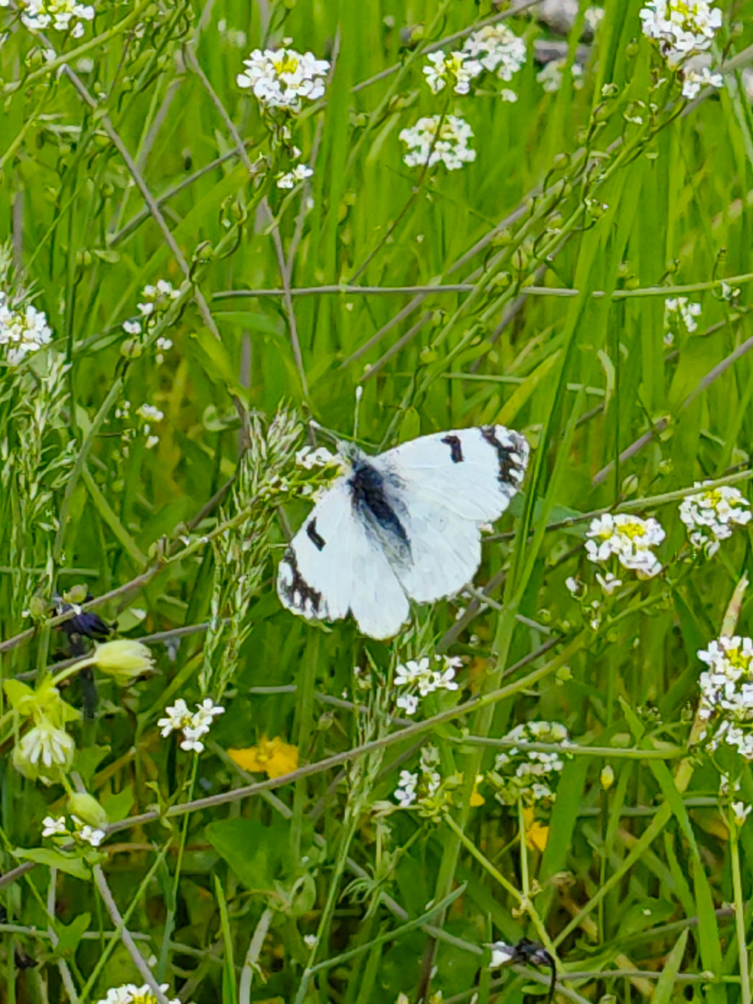 The image shows a butterfly, likely a *Pontia daplidice* (Bath White) given the markings, perched on a plant with small white flowers among green grasses. The environment appears to be a field or area…read more