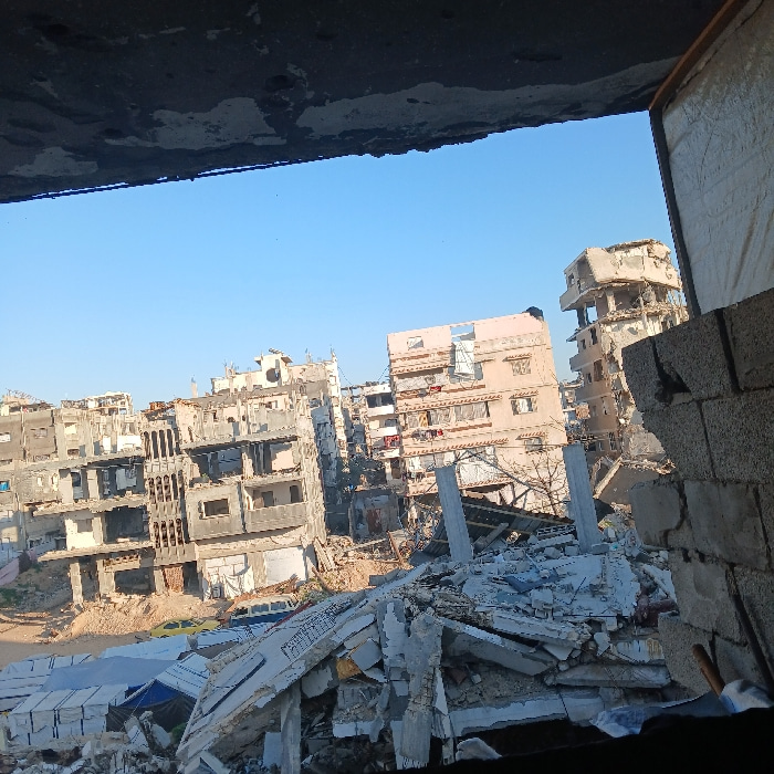 The image displays a panorama of severe urban destruction in the city of Gaza, Palestinian Territory, viewed from within a damaged structure. The foreground is dominated by a vast expanse of collapsed…read more