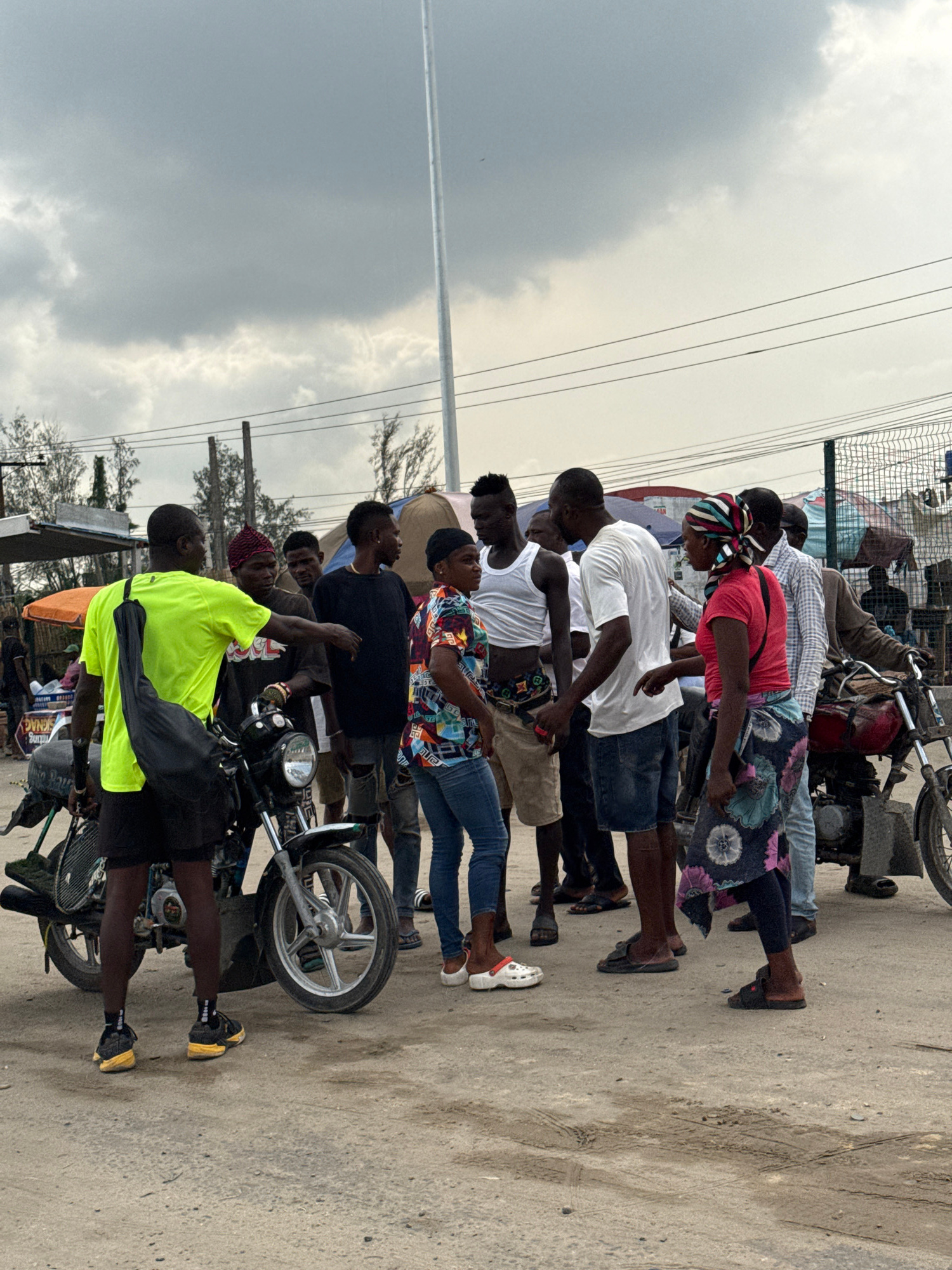 This image depicts a daytime street scene in what appears to be an urban or semi-urban environment, identified as Lekki, Nigeria. The sky is overcast, suggesting cloudy weather conditions. A group of…read more