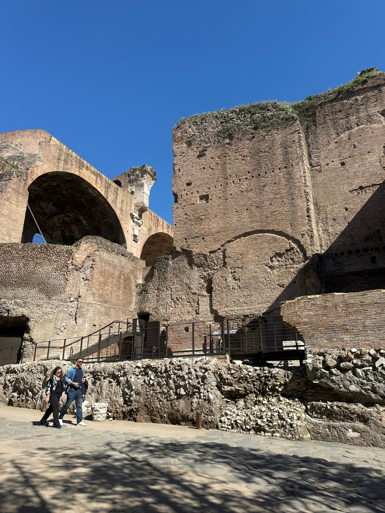 The image shows a view of the Roman Forum in Rome, Italy. The foreground features a paved pathway, partially obscured by tree shadows, where two individuals are walking. To the left of the pathway, th…read more