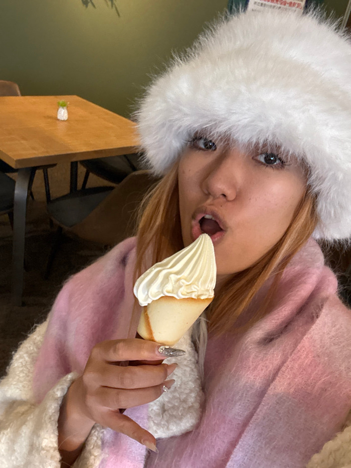 A young woman wearing a fluffy white hat and pink sweater holds a pointed dessert with white frosting close to her open mouth. Her long, ornate nails are adorned with gemstones. She appears to be indo…read more