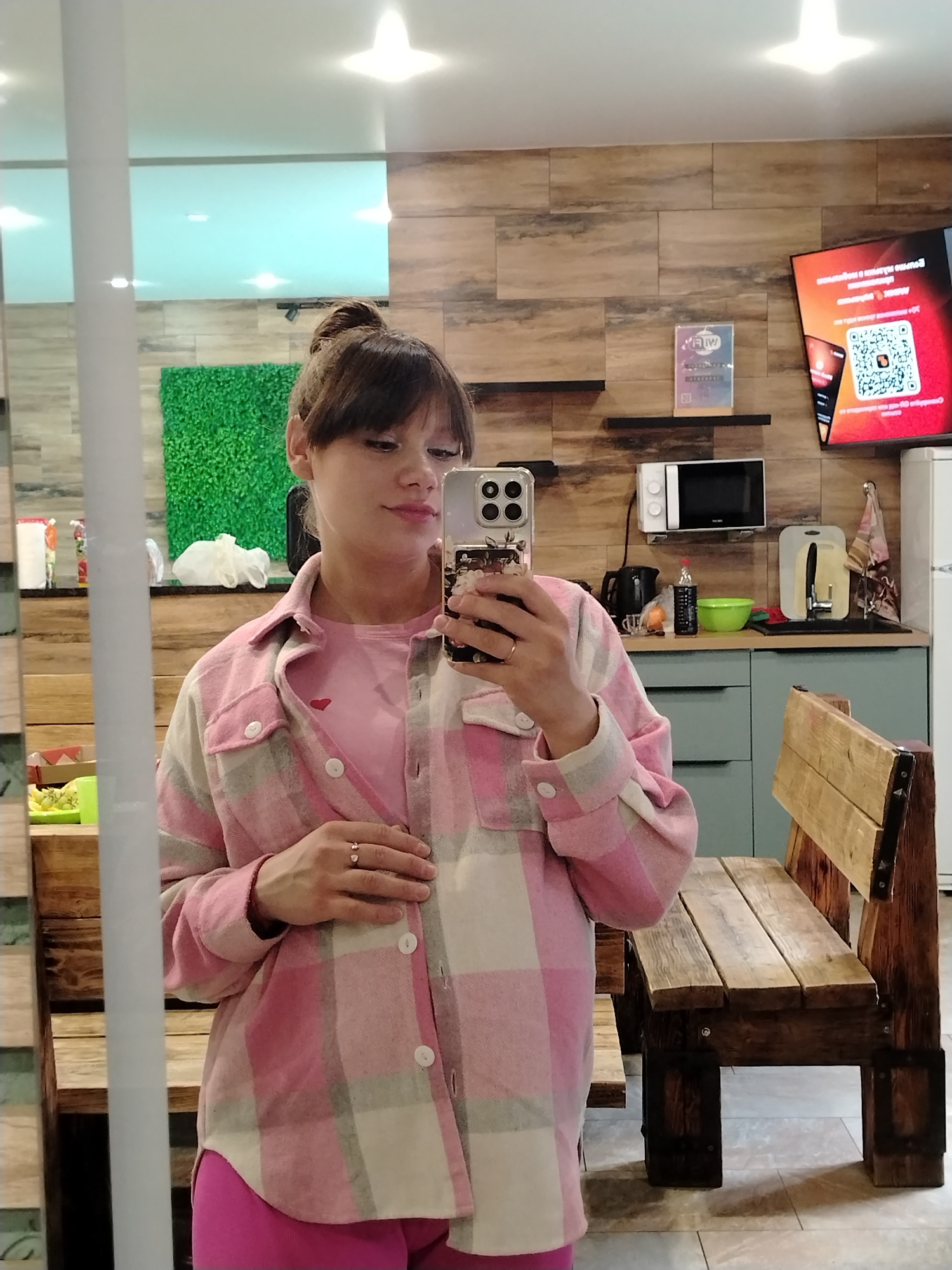 A young woman is captured in a mirror selfie within what appears to be a casual communal space in Chaikovsky, Russia. She has dark hair tied in a bun with bangs, and a light make-up. She holds her sma…read more