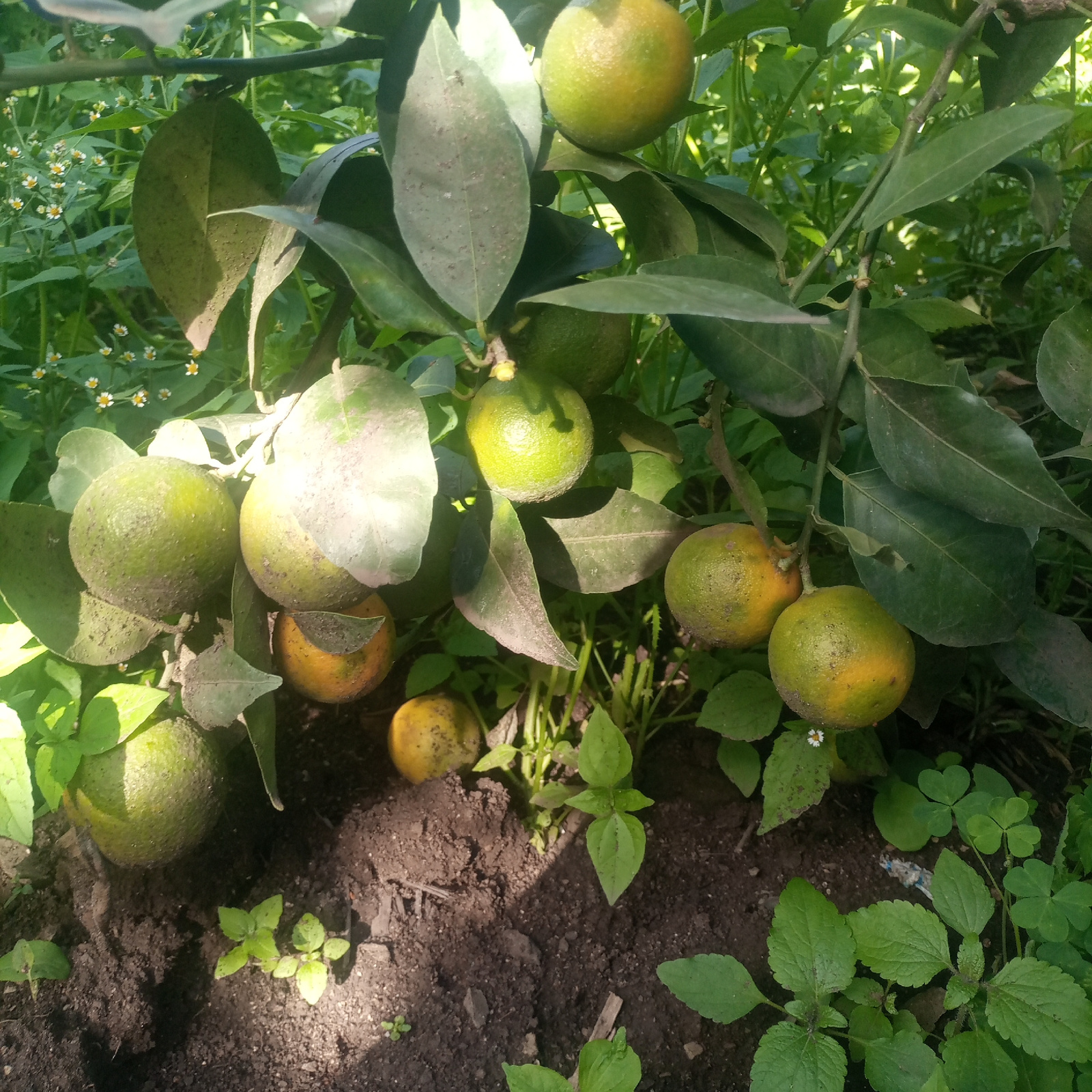 A close-up view shows a citrus tree bearing fruit in an outdoor environment within Kimorori/Wempa ward, Kenya. Approximately ten spherical citrus fruits are visible, varying in ripeness from green wit…read more