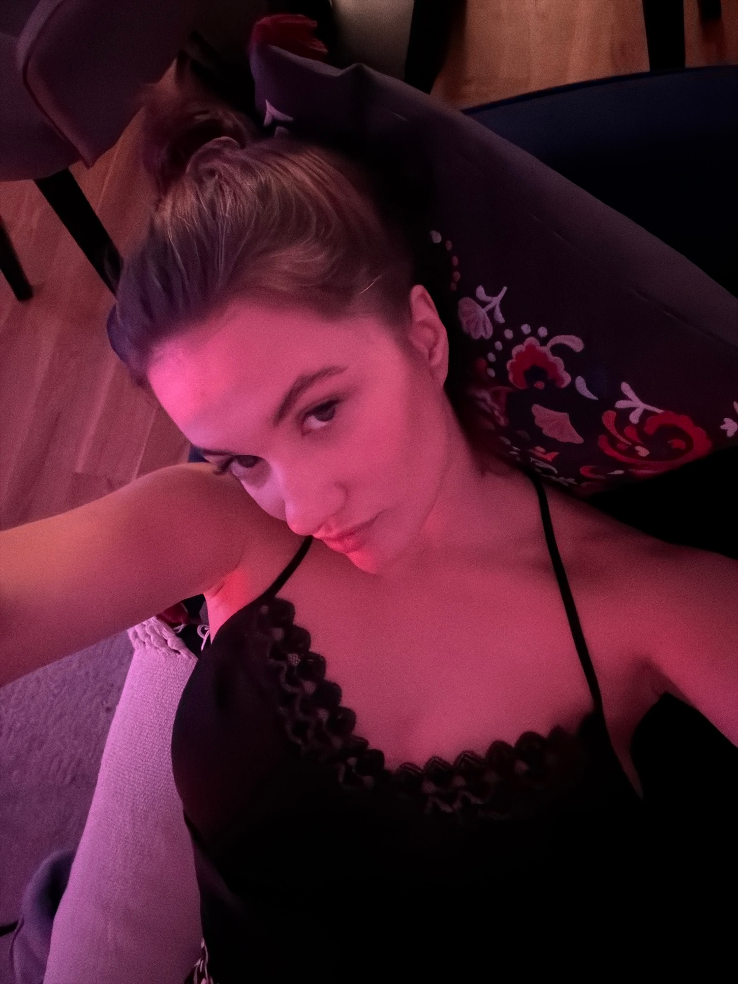 The image depicts a single female subject within an indoor environment. The subject, a young adult with light-colored hair pulled back into an updo, is positioned at an angle, directing her gaze towar…read more