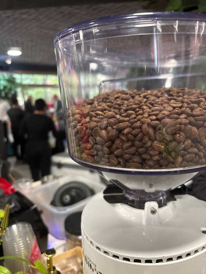 The image depicts a close-up, slightly elevated perspective of a white Nuova Simonelli coffee grinder (partial branding "NOVA SIM" visible on its lower body). Its transparent plastic hopper is filled…read more