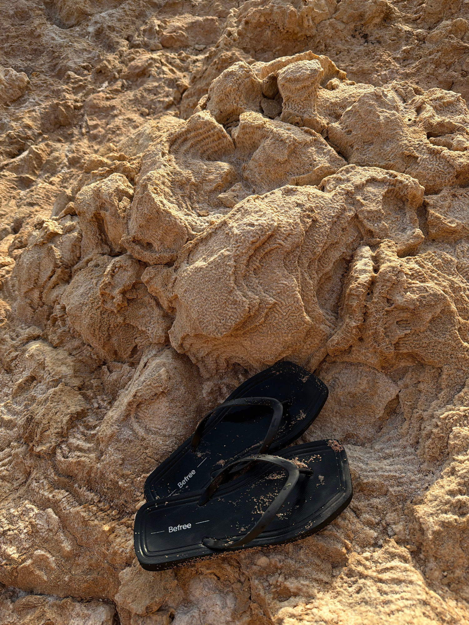 A pair of black Befree-brand flip-flops rest on a rough, light brown rock formation. The rock appears to be weathered or sedimentary, with intricate patterns and textures. The scene is located outdoor…read more