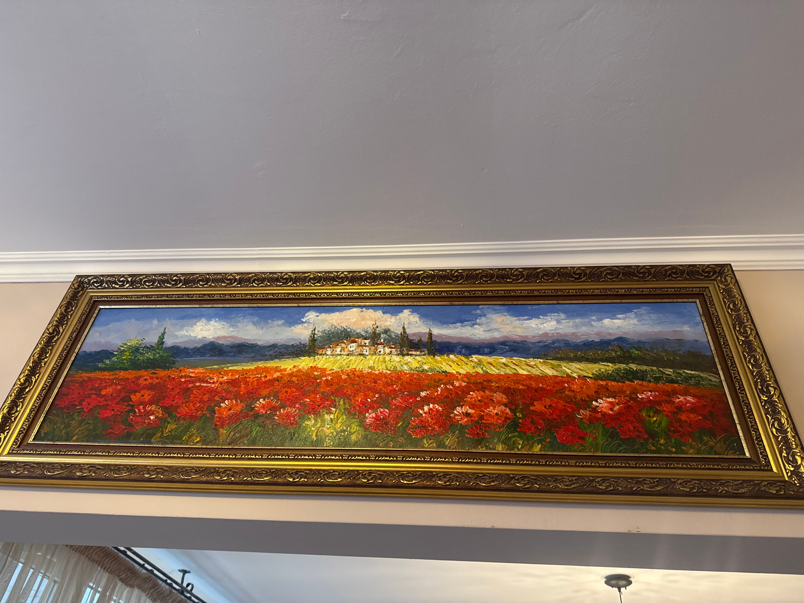 A landscape painting in an ornate gold frame hangs on a light-colored wall. The painting depicts a field of red flowers in the foreground, leading to a patch of yellow crops and a village or small tow…read more