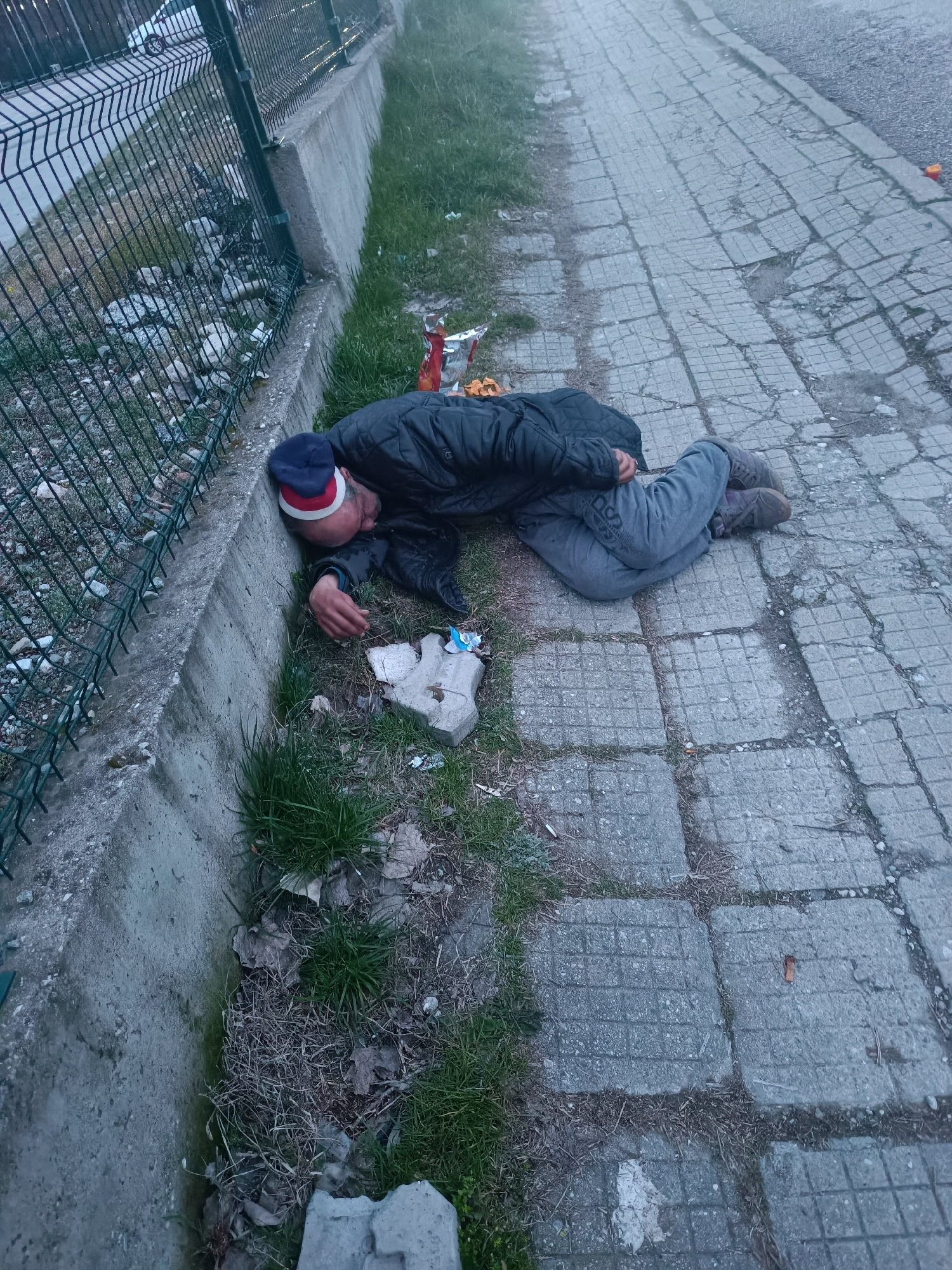 In Asenovgrad, Bulgaria, an adult male lies on his left side, curled on a patch of grass and dirt adjacent to a cracked concrete paver sidewalk. He is dressed in a dark quilted jacket, grey sweatpants…read more