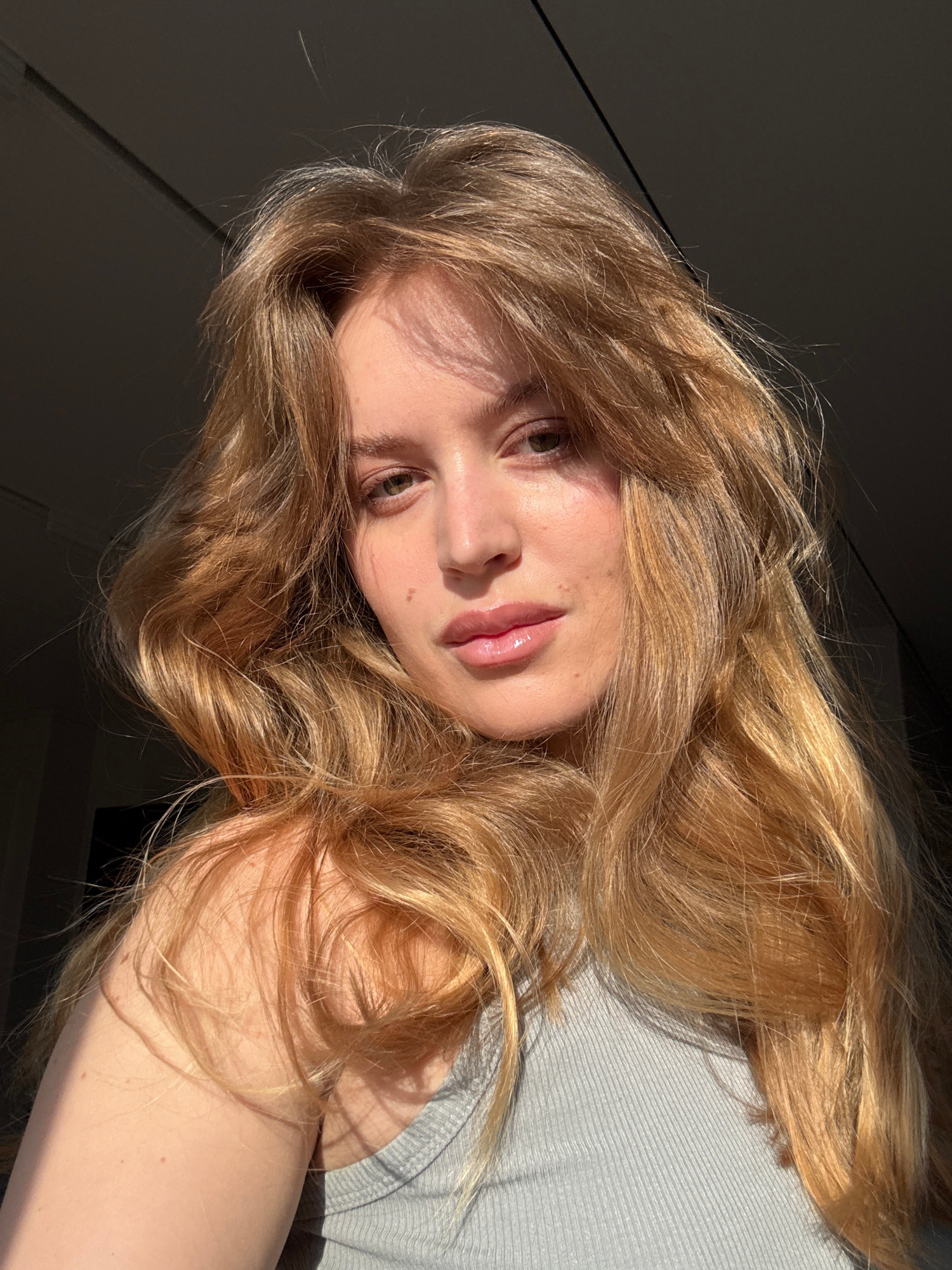 A young woman with long, blonde hair lies on a gray surface. Her face is tilted towards the camera, displaying fair skin and natural-looking lips with some shine. The left side of her face is in shado…read more