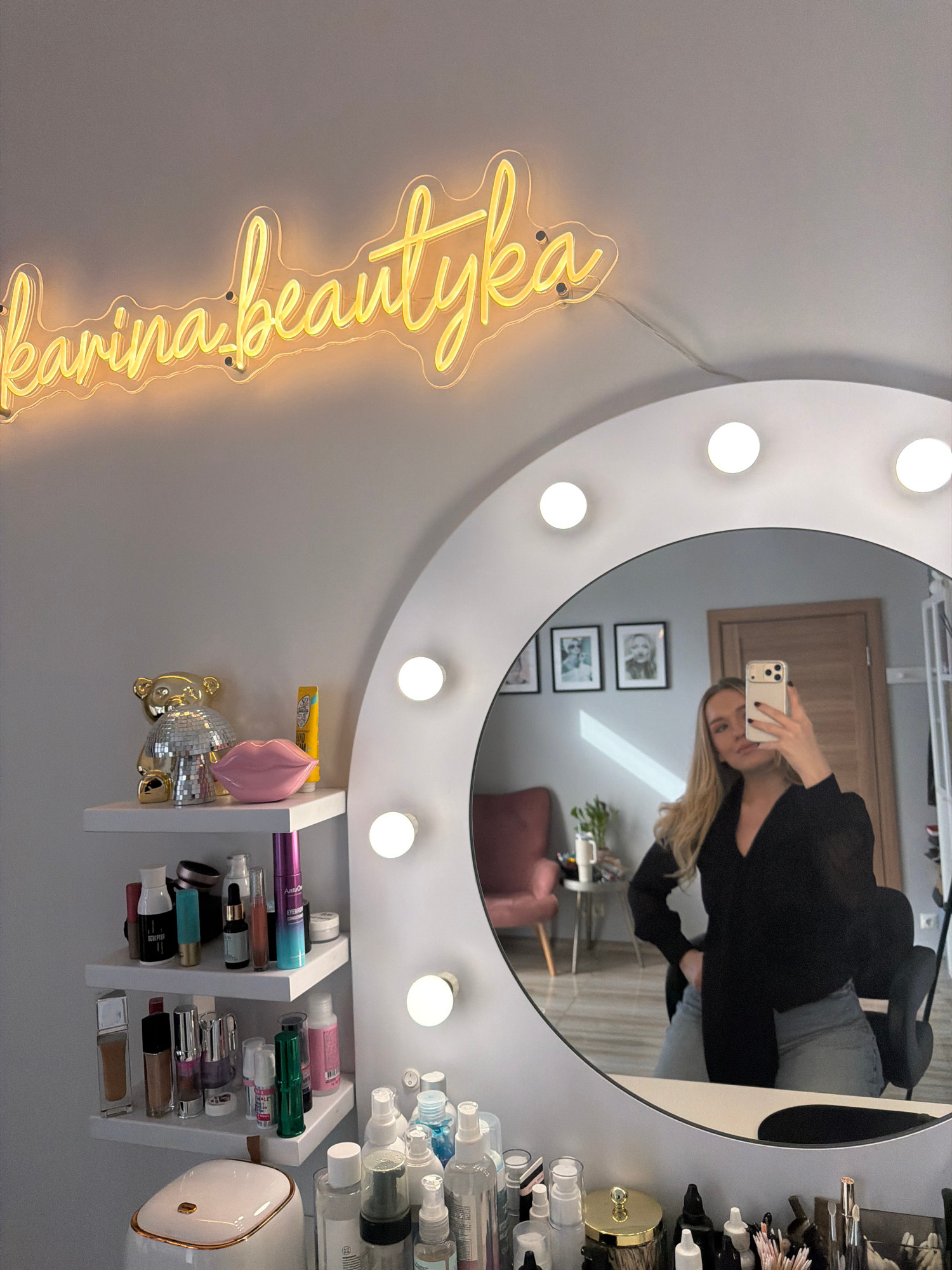 The image depicts a vanity area, likely within a private residence, and potentially located in Riga, Latvia, as "karina beautyka" may be a reference to a local beauty service or individual in that cit…read more