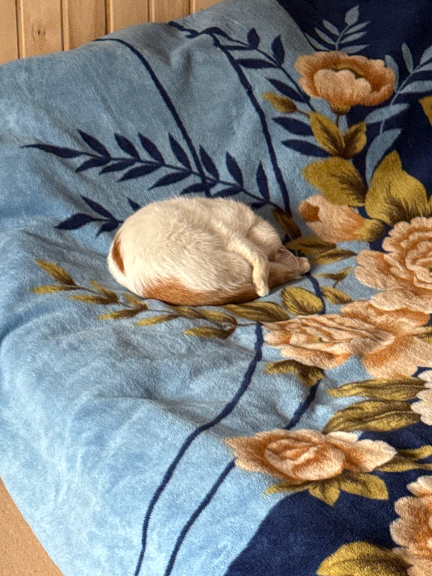 A curled-up white and tan guinea pig sleeps on a blue floral blanket. The blanket is decorated with light brown roses and green leaves with dark blue outlines and a darker blue edge. The background in…read more