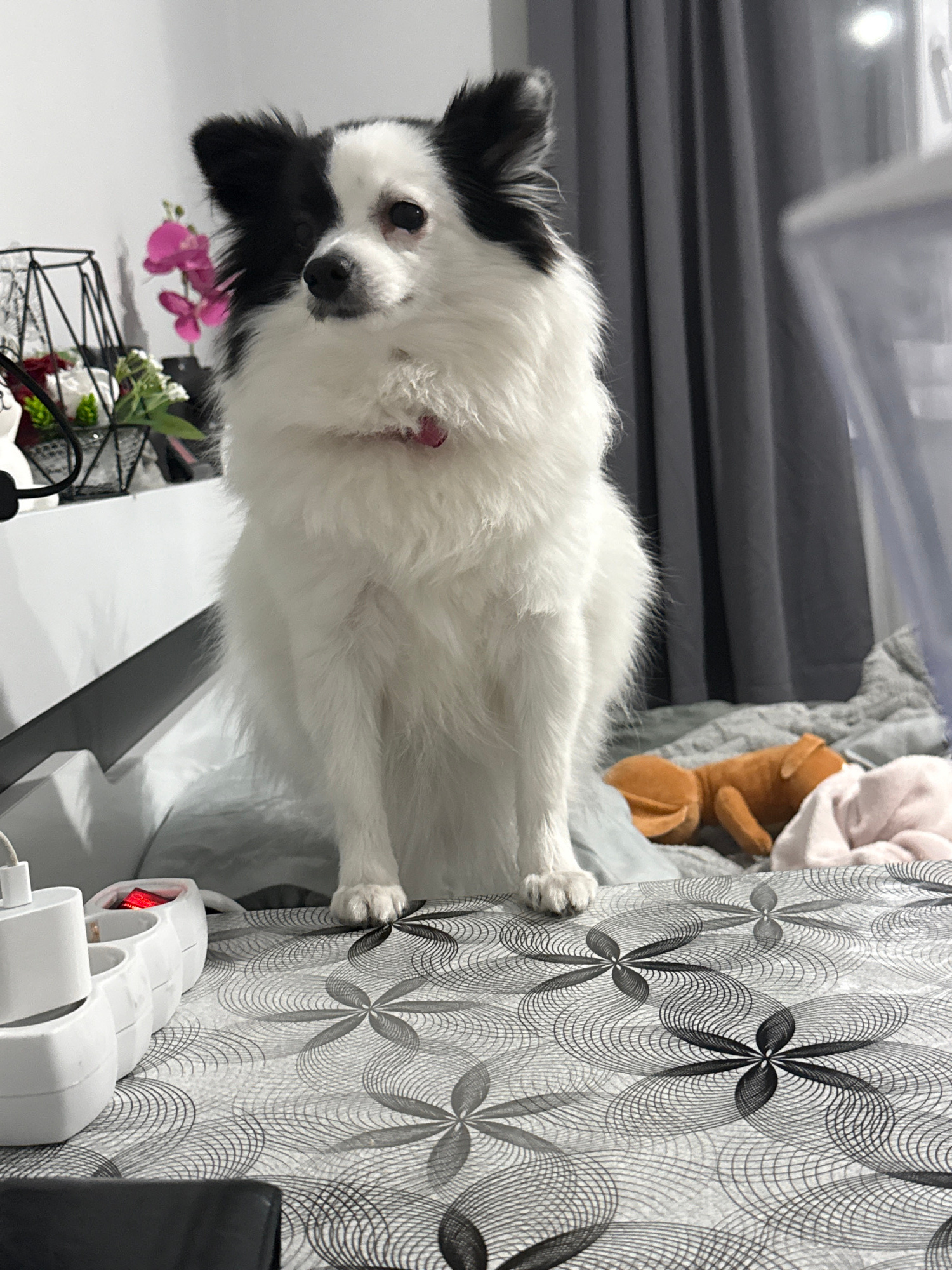 A small, long-haired, white dog with black markings around the eyes and ears stands on a table next to a white wall. The dog is facing the camera with its body positioned diagonally from the lower lef…read more
