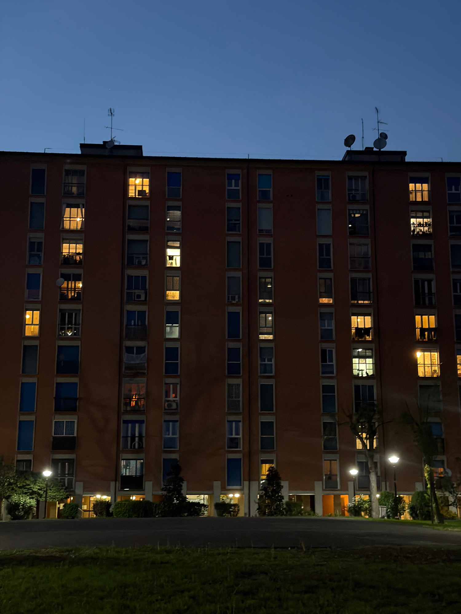 The image displays a tall, multi-story building at dusk or night in Milan, Italy. The building dominates the left and central parts of the frame, set against a clear, dark blue twilight sky. Its facad…read more