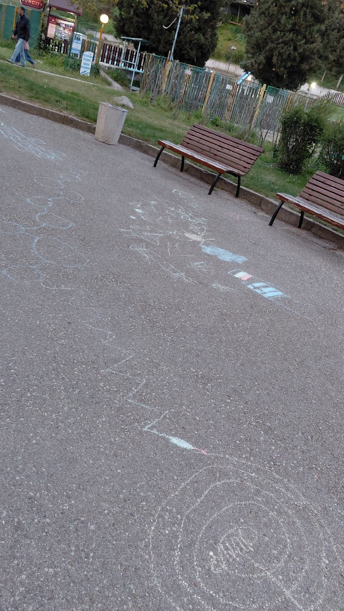 The image captures a partially angled view of a paved area in a park in Unknown, Unknown. On the left, there are several park benches with wooden slats and metal legs arranged along the edge of a gras…read more