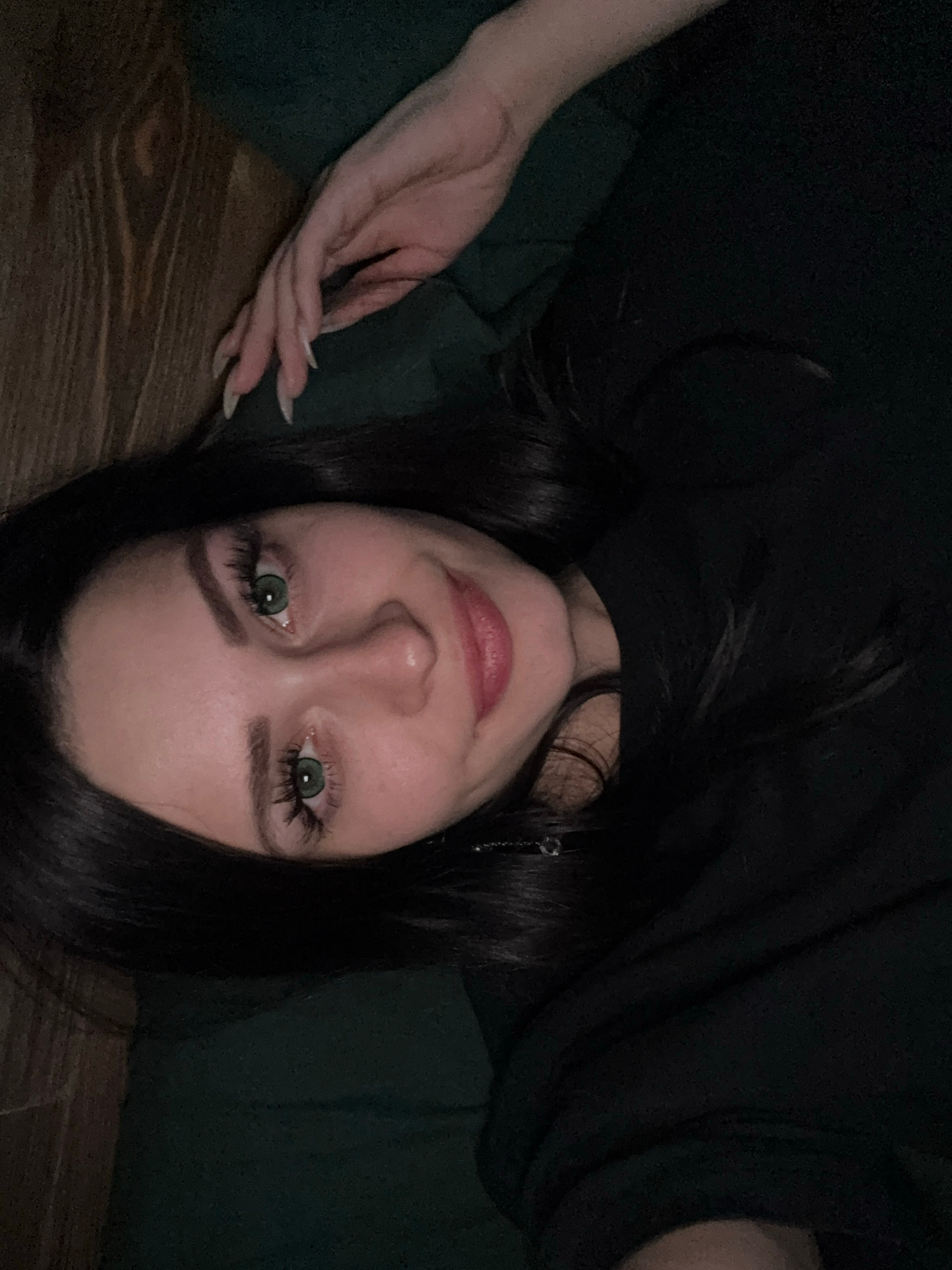 A young woman is laying down, looking up at the camera. She has long, dark hair, light skin, and green eyes. She is wearing a dark-colored shirt. Her left hand is resting on a wooden surface. The back…read more