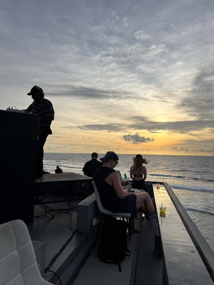 The image depicts an outdoor seaside venue in Uluwatu, Indonesia, at sunset. A male DJ, silhouetted against the sky, stands on a dark raised platform on the left, operating audio equipment with headph…read more