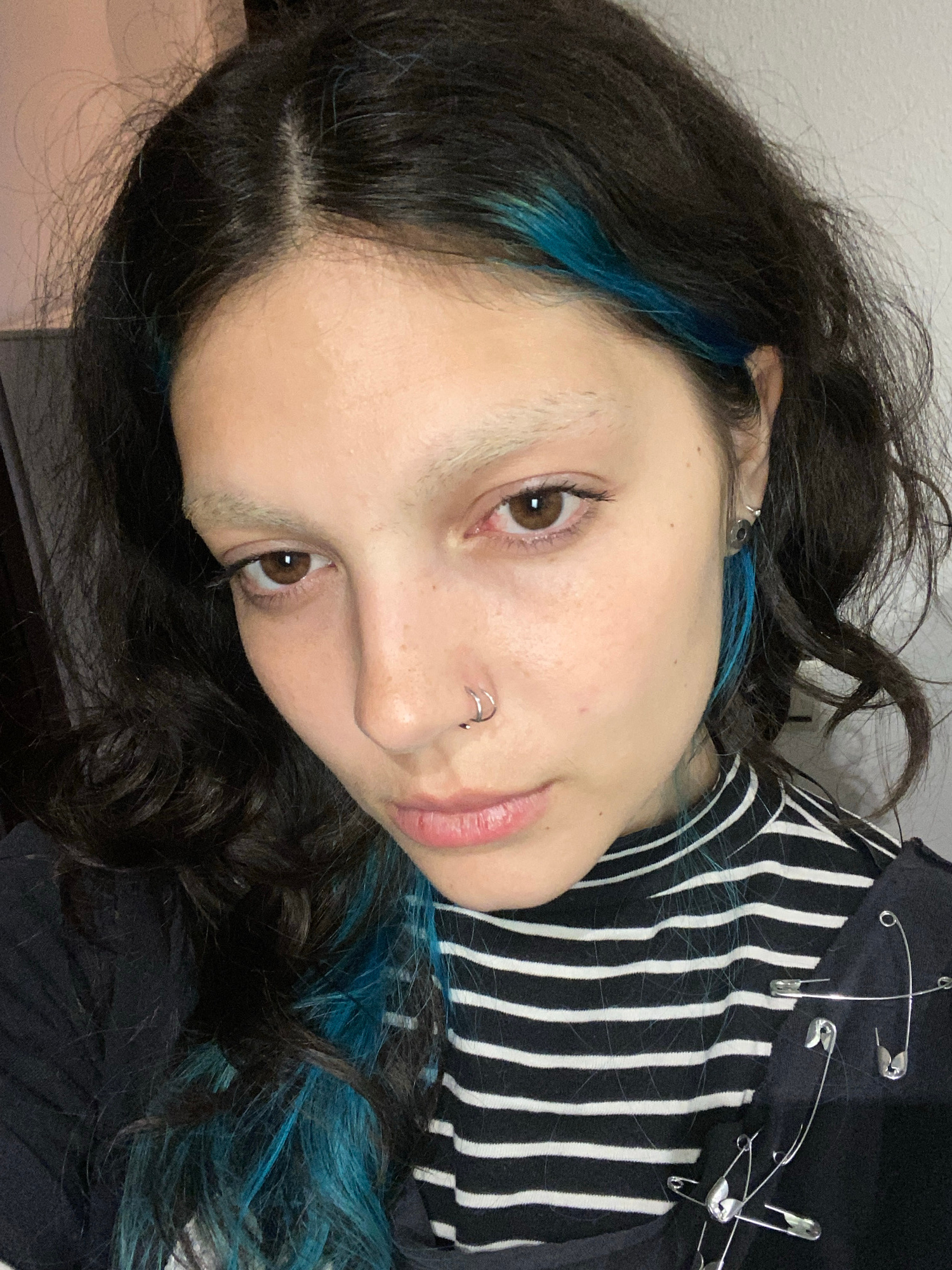 A young person lies on their left side, face directed towards the camera. The person has dark brown eyes, a nose ring, and dark hair with streaks of bright blue. They are wearing a black and white str…read more