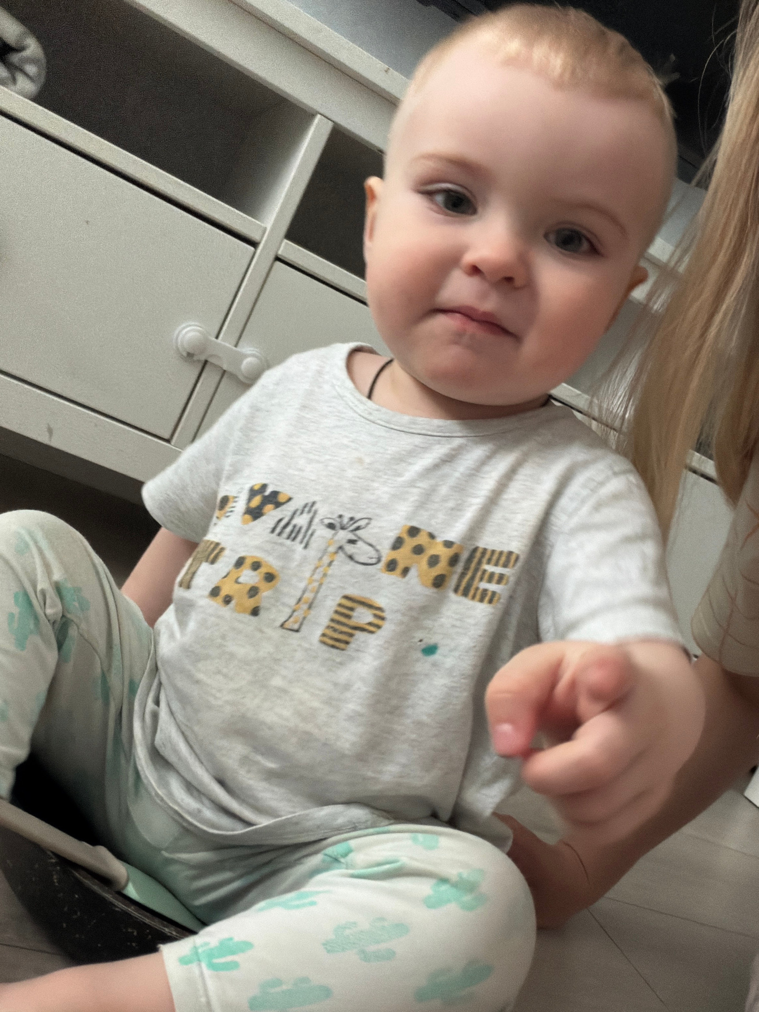 A toddler with fair skin, light blonde hair, and wearing a light gray t-shirt with animal print letters and a giraffe design is seated on the floor. The child is pointing with their right hand towards…read more