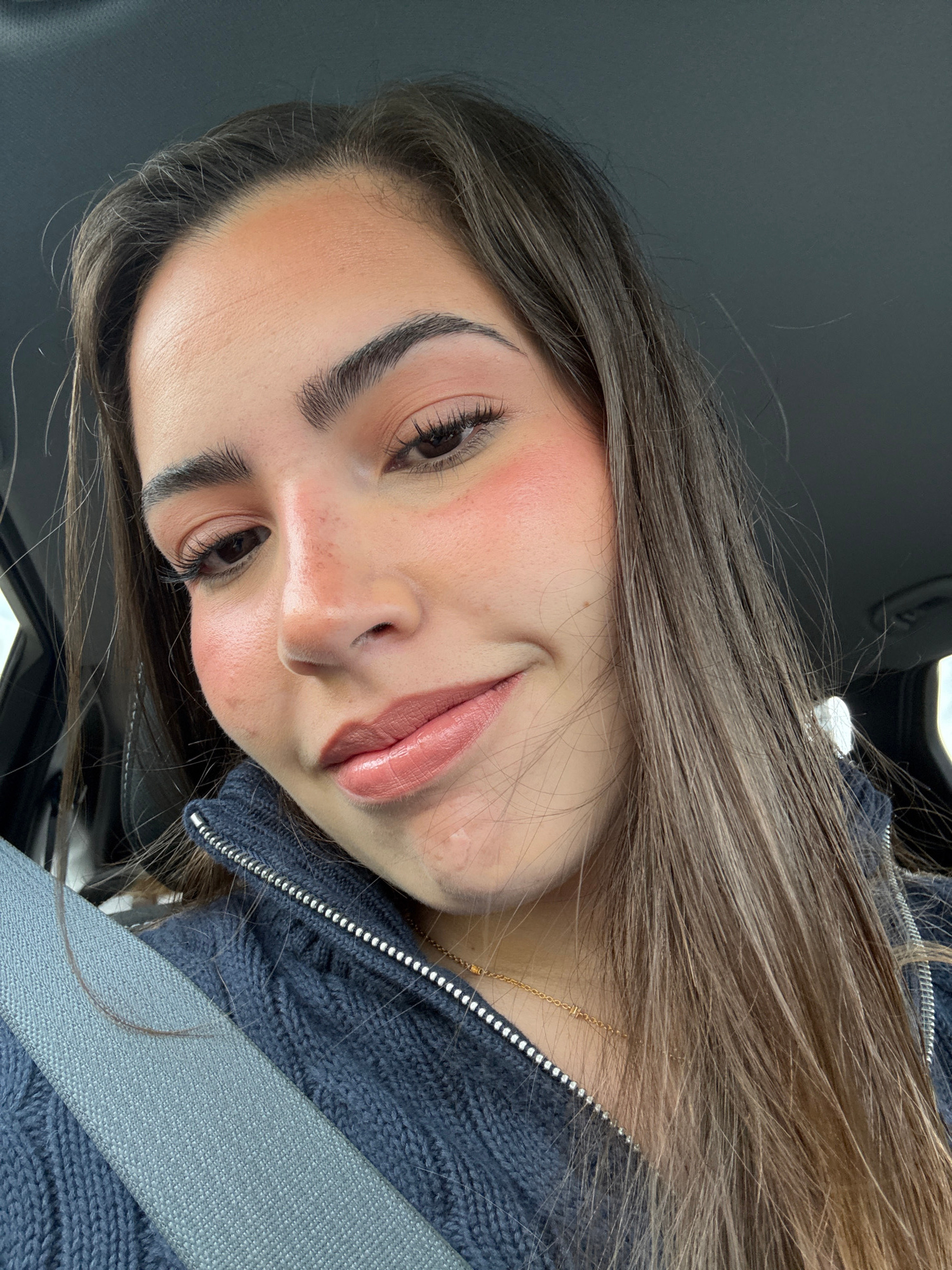 A young woman with brown hair and makeup is in a car, wearing a blue sweater and a seatbelt. The location is likely San Antonio, United States, based on the metadata.