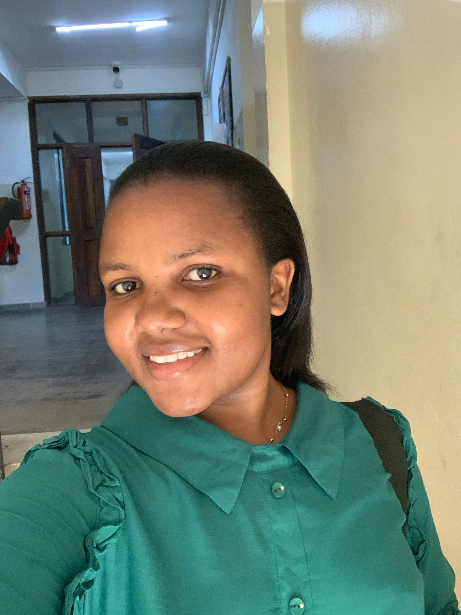 The image shows a woman with dark hair and skin smiling at the camera. She is wearing a green collared shirt with ruffle details. A gold bracelet is visible on her wrist. In the background, there's a…read more