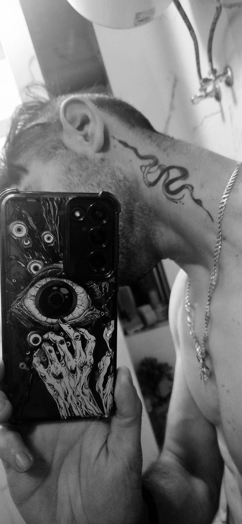 A person takes a selfie in what appears to be a bathroom mirror. The person has a snake tattoo on their neck and is wearing a silver chain. They are holding a smartphone with a black case featuring a…read more