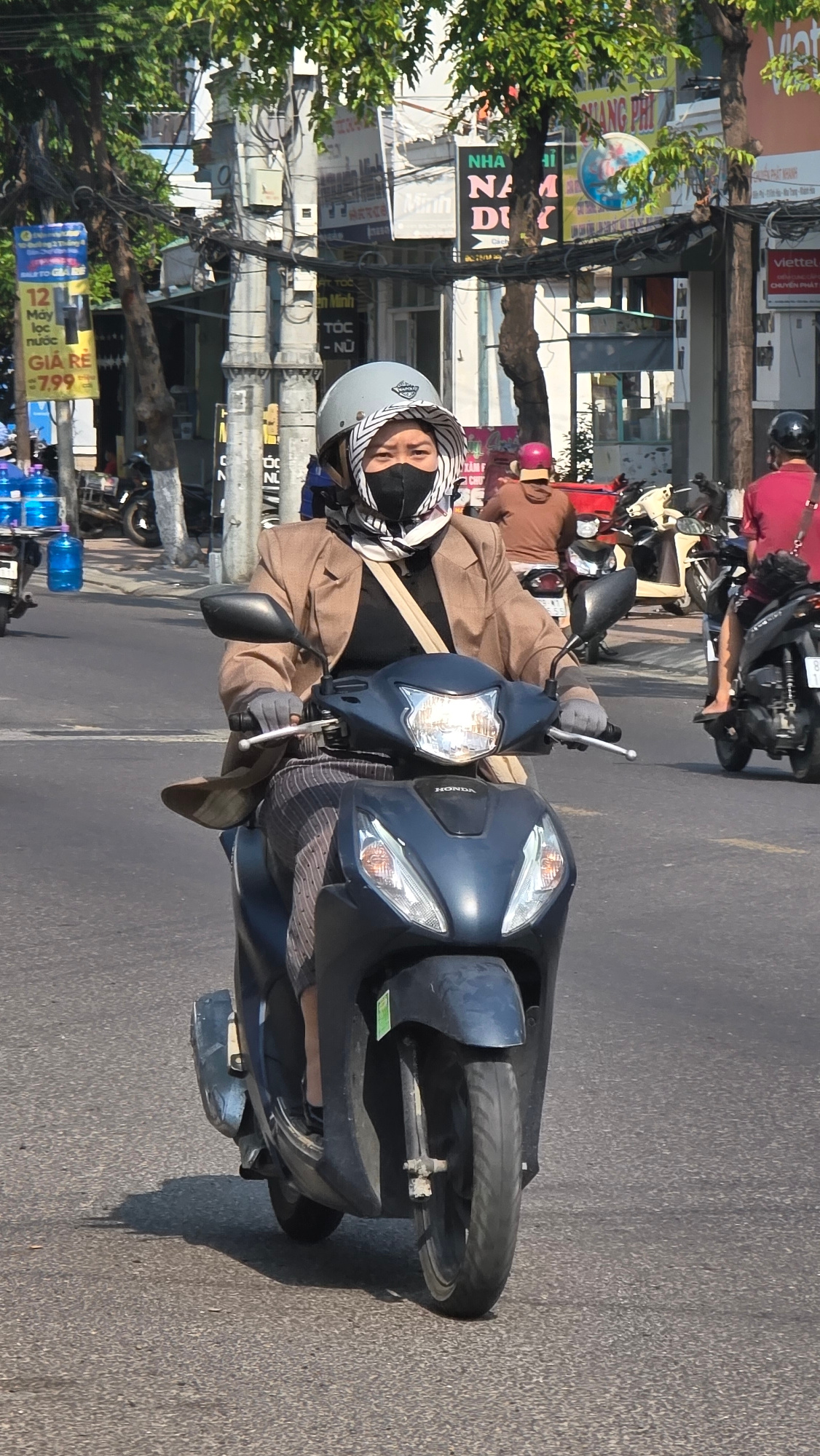The photograph shows a person riding a blue Honda motorcycle on a city street. The rider is wearing a beige helmet with a black and white scarf, a black face mask, a brown jacket, and gray gloves. In…read more
