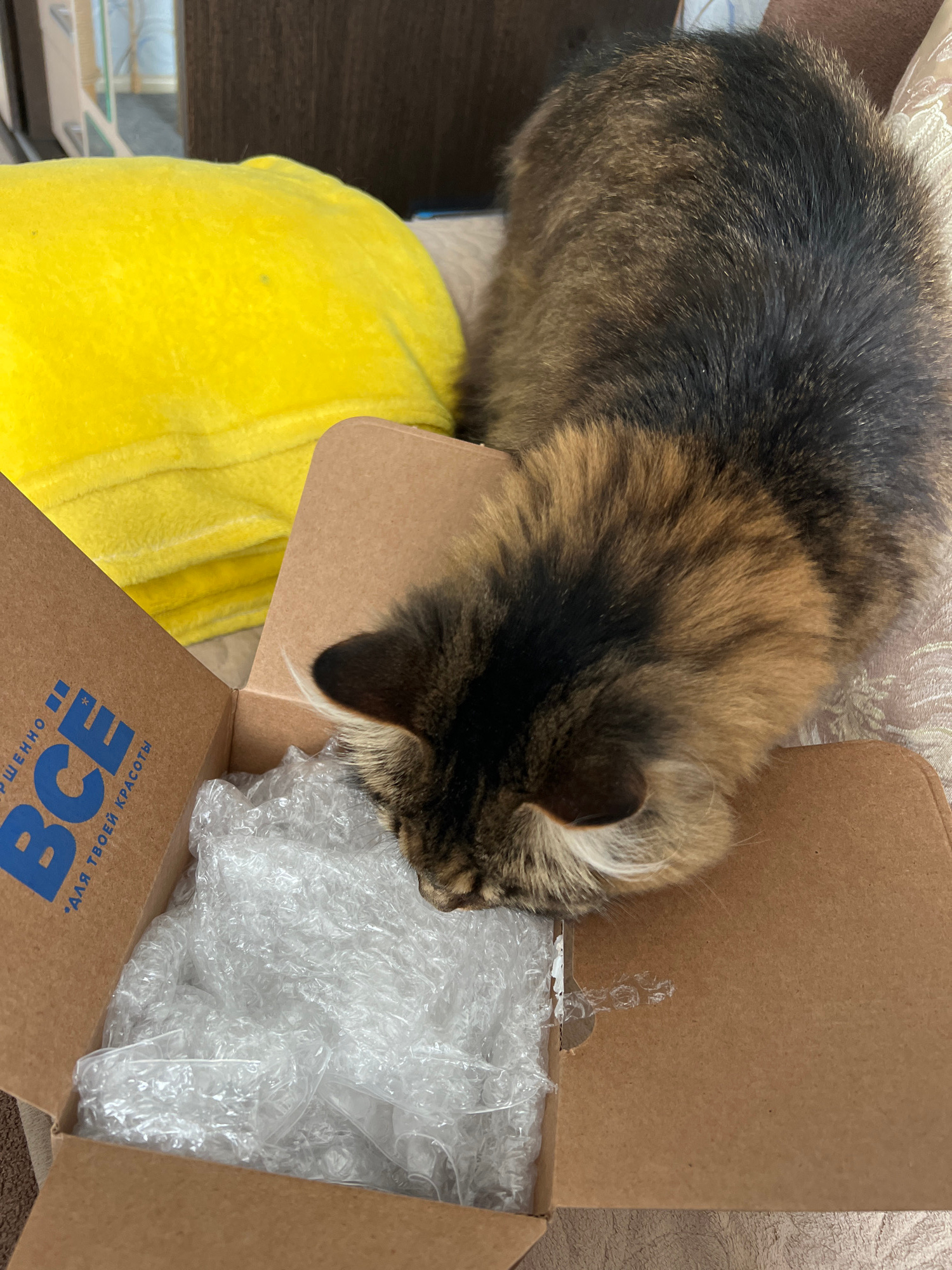 A brown tabby cat is partly inside a cardboard box filled with bubble wrap. A yellow blanket is partially visible to the left of the box. The box has Russian text on it, indicating it may have been sh…read more