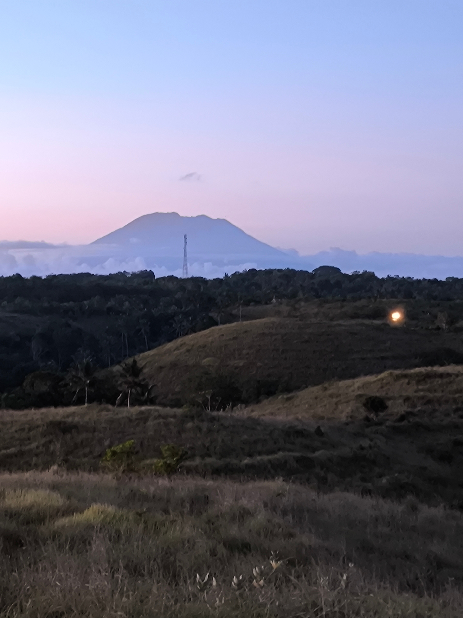 The image shows a landscape in Nusa Penida, Indonesia, at dusk or dawn. In the background, a mountain with a communications tower is visible above a layer of clouds. A dark treeline and rolling hills…read more