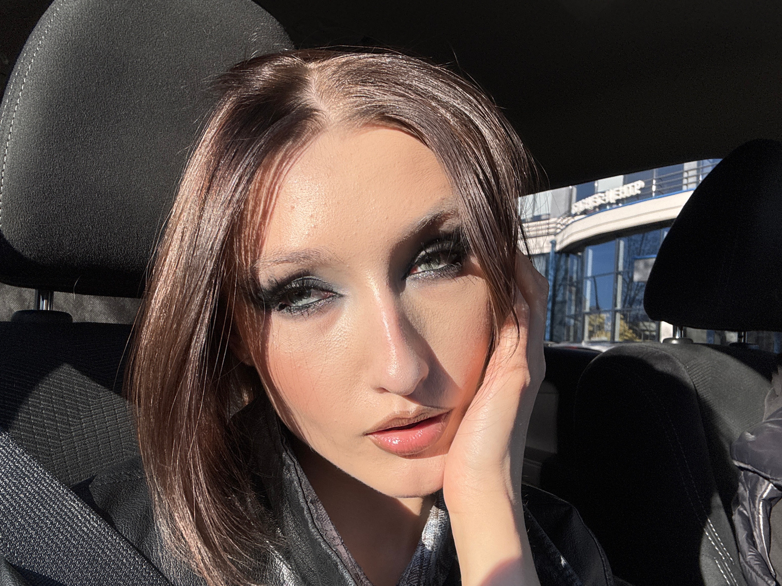 A woman with dark brown hair and heavy eye makeup is pictured indoors, likely in a car. She is fair-skinned with glossy lips and her hand is positioned near her face. She wears a dark, possibly leathe…read more