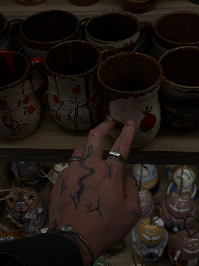 A close-up view depicts a person's tattooed right hand reaching forward to touch a handmade ceramic mug displayed on a wooden shelf. The hand features a prominent snake tattoo winding across its back…read more