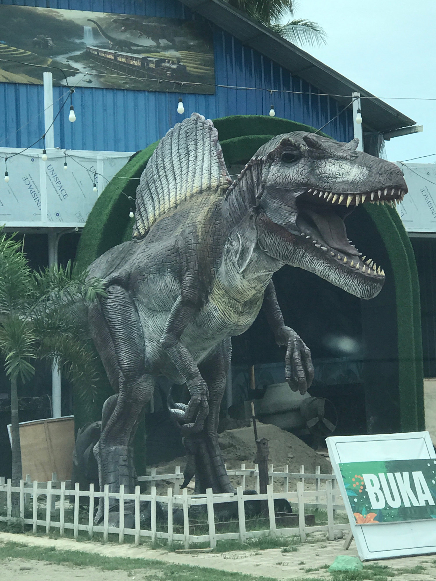 An outdoor view in Lhokseumawe, Indonesia, shows a large, gray dinosaur statue with an open mouth and visible teeth. The statue has a ridged sail-like structure on its back. It's positioned against a…read more
