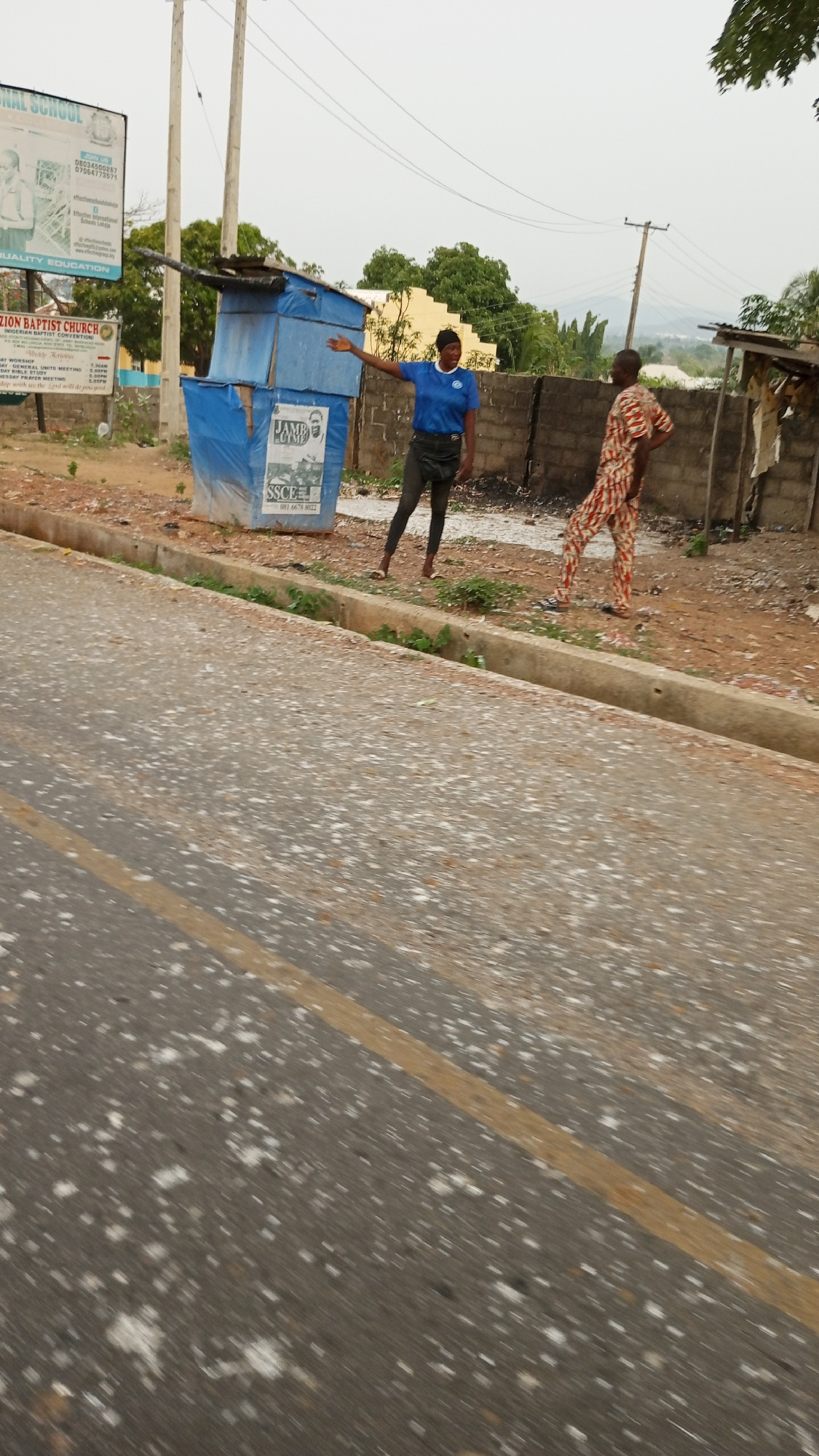 The image shows a street scene in Adankolo, Nigeria. A woman wearing a blue shirt and black pants stands near a makeshift blue structure with posters on it by the side of the road. The posters appear…read more