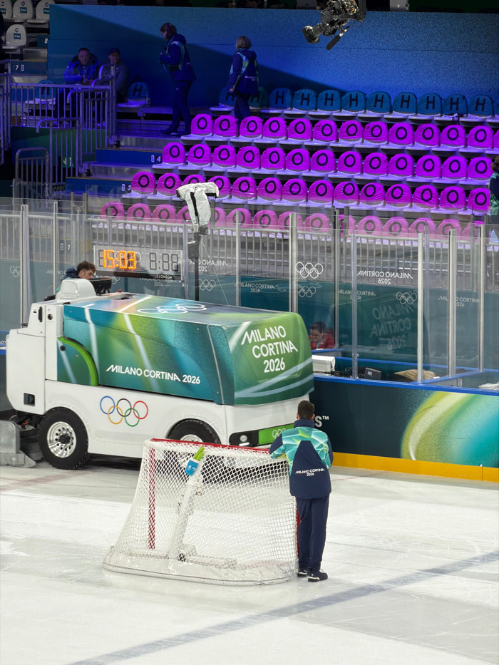 The image captures an indoor ice rink scene, oriented in landscape format despite appearing rotated in the original file. The setting appears to be an arena, possibly for ice hockey or another ice spo…read more